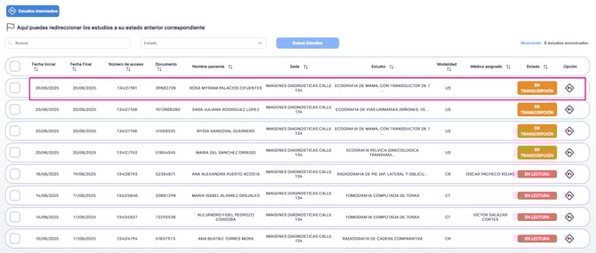 Revise la lista y ubique el estudio que necesita ser devuelto a su estado correcto dentro del flujo asistencial.