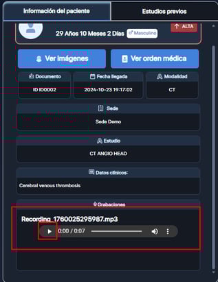 En esta sección podrá escuchar la grabación realizada por el médico radiólogo.