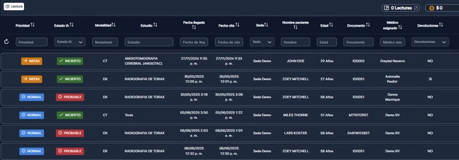 2. Se visualizará la lista de los registros que se encuentran pendientes de lectura por el médico radiólogo.