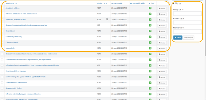 Al ingresar, se mostrará r la lista de CIE10 ya creados por nombre. De igual manera, el sistema le permite realizar búsqueda de CIE10 ya creados por medio de filtros, usando el panel del lado derecho.