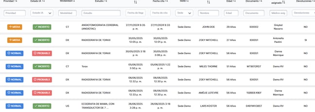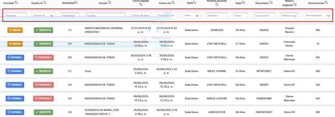 2. Se mostrará la lista de los registros que se encuentran pendientes de lectura por el médico radiólogo.