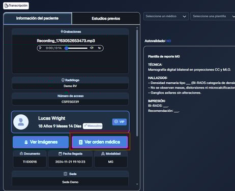 Aquí se describe el proceso para visualizar la orden médica de un registro desde la lista de trabajo de transcripción en Aquila.
