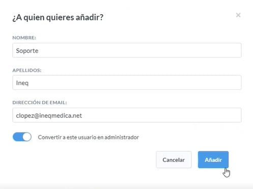 4. Luego abre la siguiente ventana y se da clic en el icono superior izquierdo llamado ‘Añadir Alguien’, se configura según la solicitud del cliente y se activa la opción de convertir usuario en administrador como se muestra en la imagen.