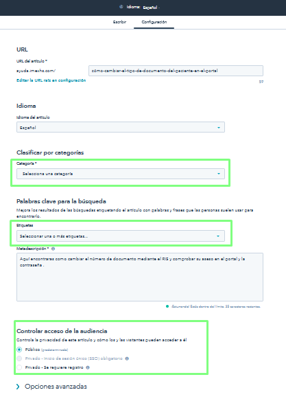 | Acceso de la audiencia | Dejar la opción Público, ya que está dirigida a Clientes. | Seleccionar la opción Privado y en el menú desplegable elegir soporte Partner para distribuidores y Soporte Interno para equipo IMEXHS | |