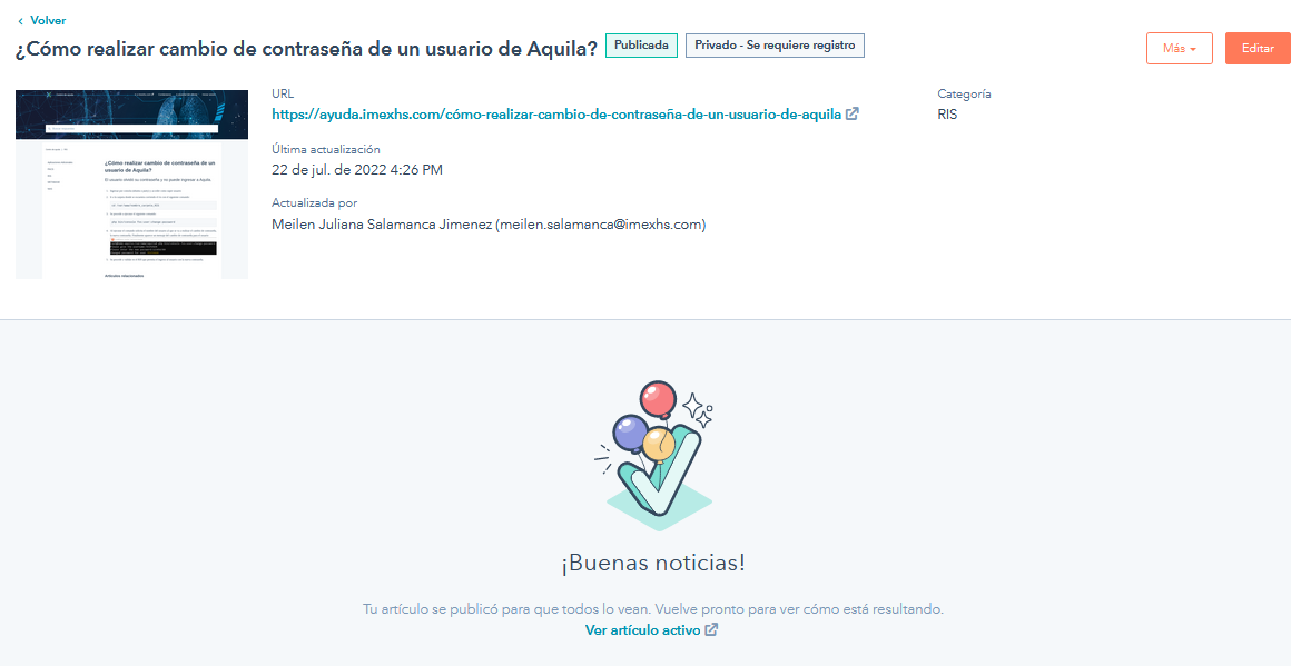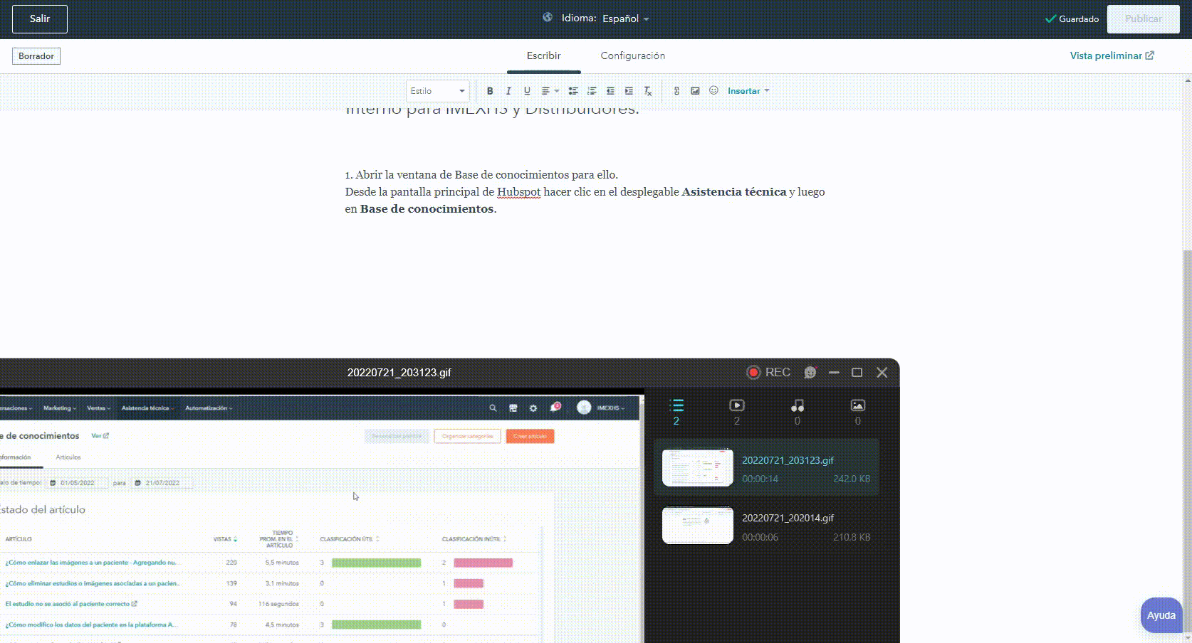 Aquí aprenderá a crear y publicar artículos en la base de conocimiento dirigidos a Clientes, e Interno para IMEXHS y Distribuidores.