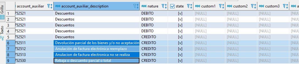 5.Nos dirigimos a la fila account_auxiliar_description, donde colocamos los datos proporcionados por el cliente