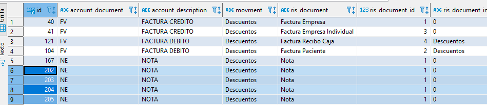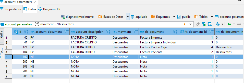 2.Donde se debe ingresar a la tabla de account_parameters, se realiza el filtro correspondiente movment = 'Descuentos'
