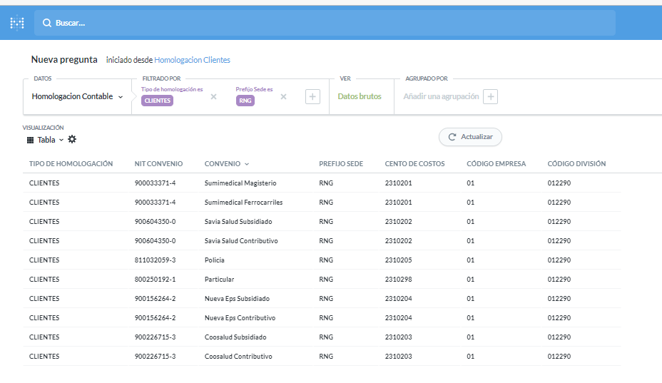 1. Se ingresa al METABASE de la sede de Prodiagnostico en el siguiente link pueden validar cuales son los centros de costos configurados.