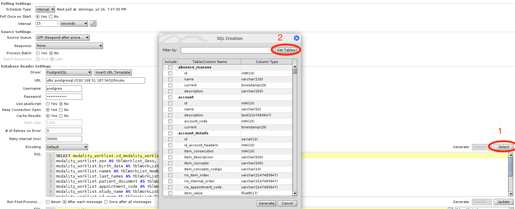 3 - Después, como se muestra en la imagen, dar clic en el círculo 1 donde dice select, posteriormente aparecerá un recuadro donde se debe dar clic en el círculo 2 para que traiga los datos, si trae los datos la conectividad con la fuente es correcta: