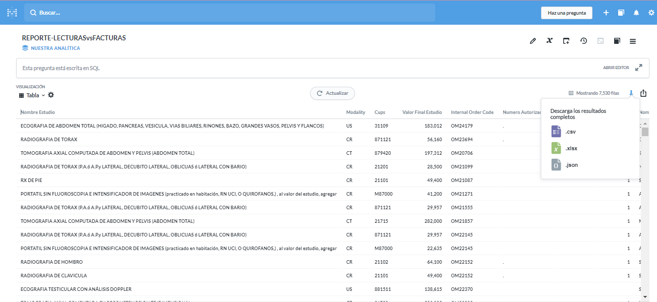 3.En la parte derecha esta la opción para realizar la descarga, el formato para realizarla será .xlsx, de esta manera ya tendremos el archivo solicitado.